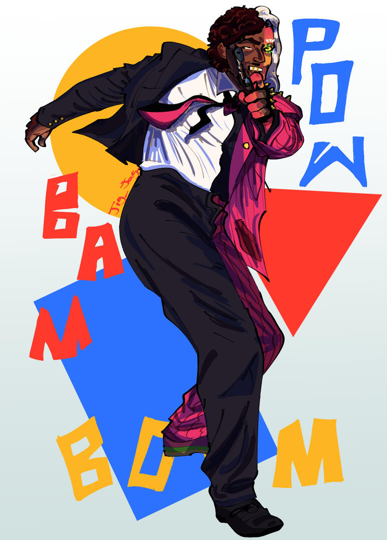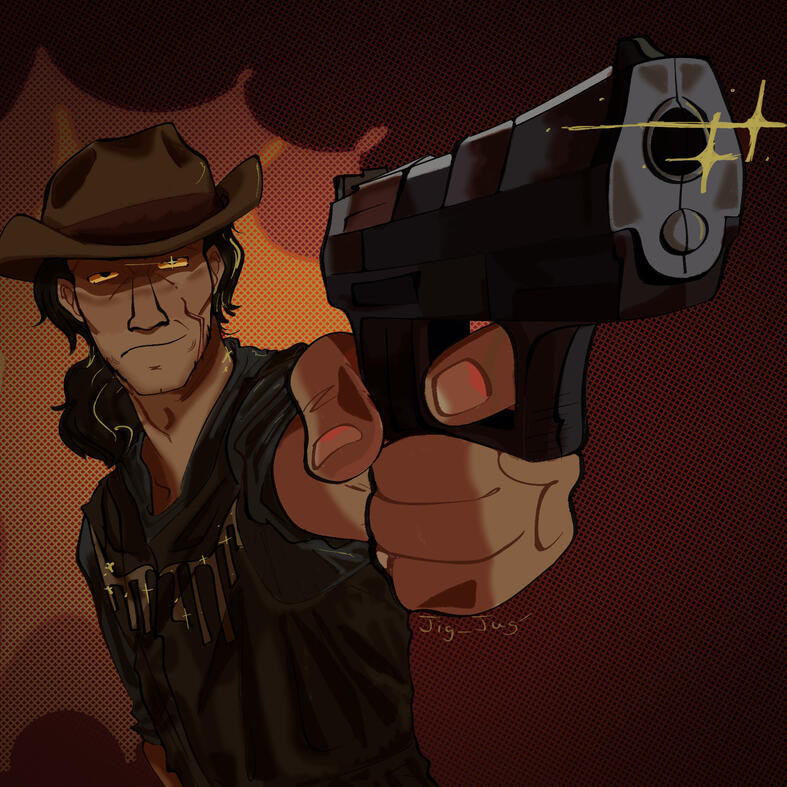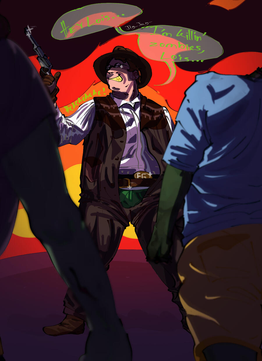 Commission for @gayassrodent on twitter of Peter Griffin in a cowboy outfit shooting zombies